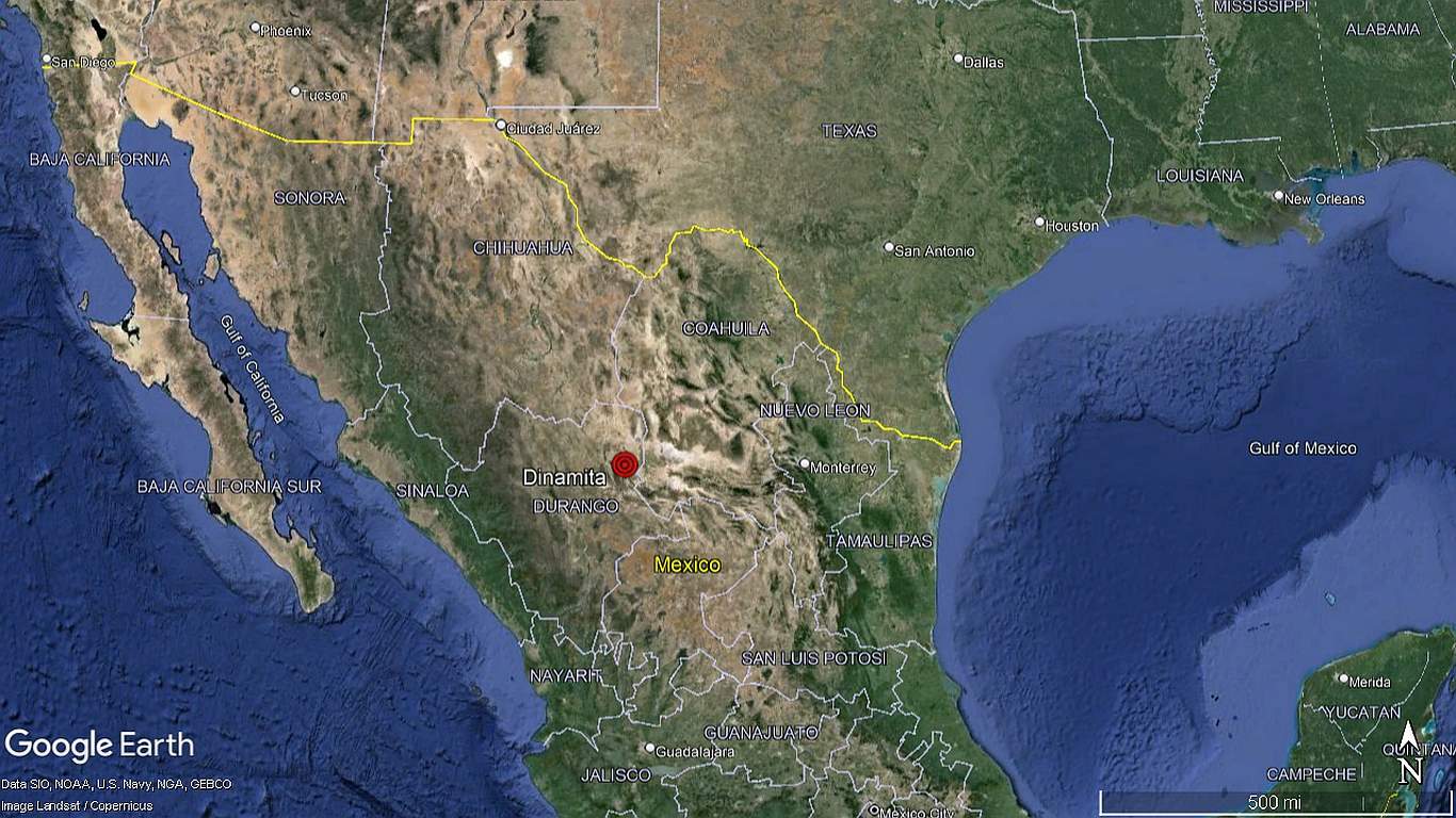 ![]() Dinamita! A meteor impact crater about 30 km NNW of Gomez Palacio, Durango, Mexico. |