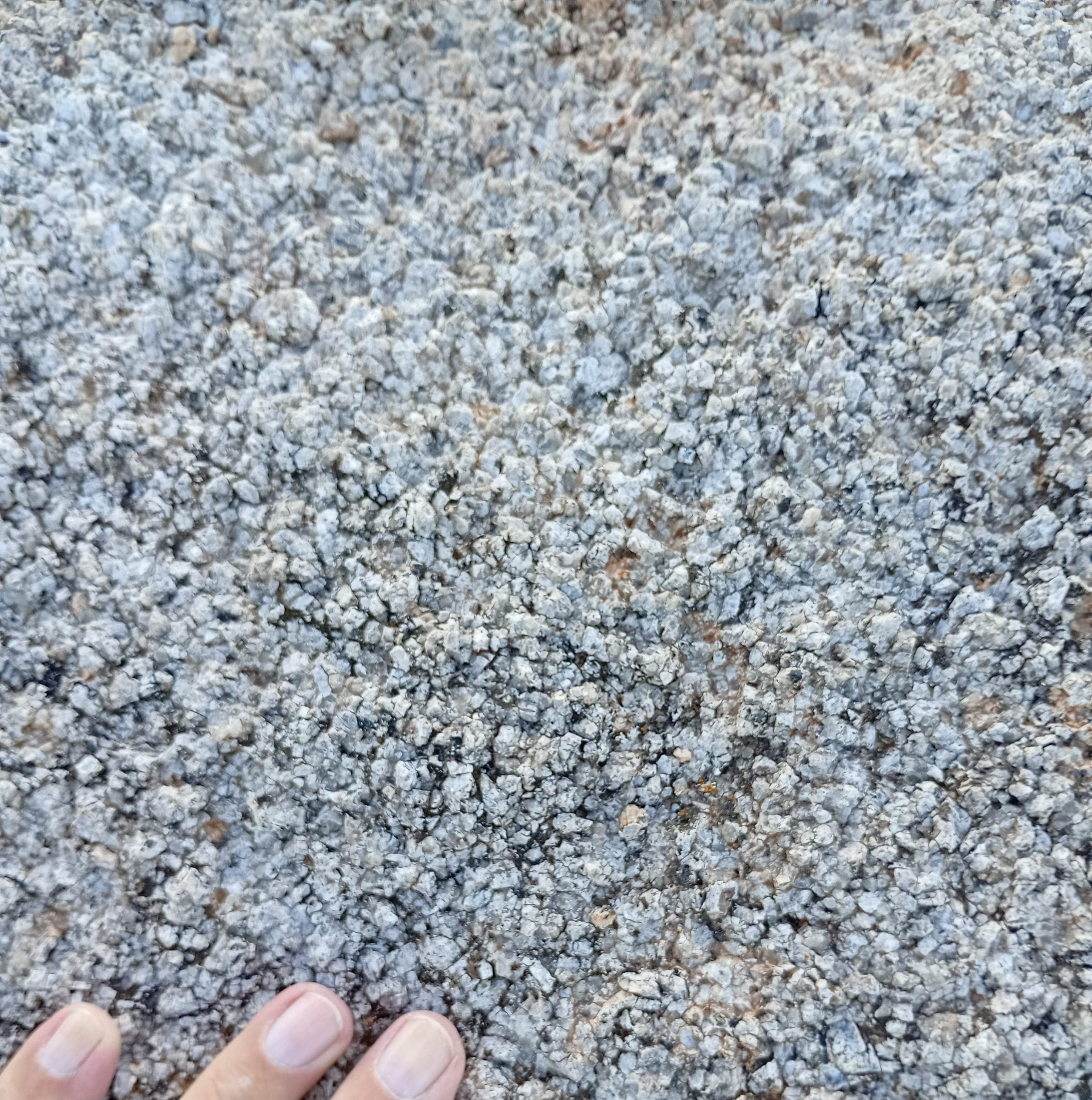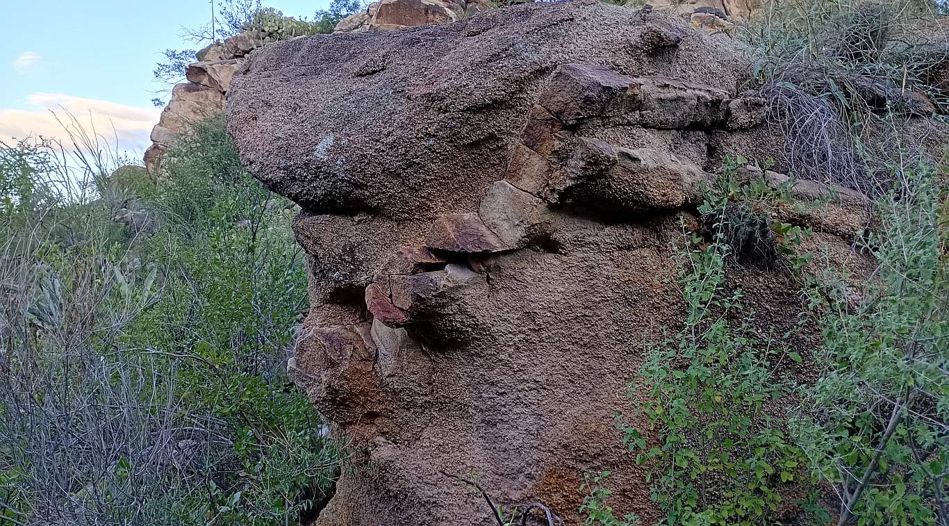 ![]() All of the rocks in the area are like this. If you wish you can rub off or pick off individual grains. All of these small perticles came together, but not as a result of outside pressure, as you would find from rocks that have been buried deep in the Earth. If these particles were blasted into the high atmosphere then came together, what force brought them together? Gravity seems unlikely as the gravity between particles would be very samll. These do not seem to be magnetic, so that force does not seem to work. The other possibility is electronic attraction in the high atmosphere. |
